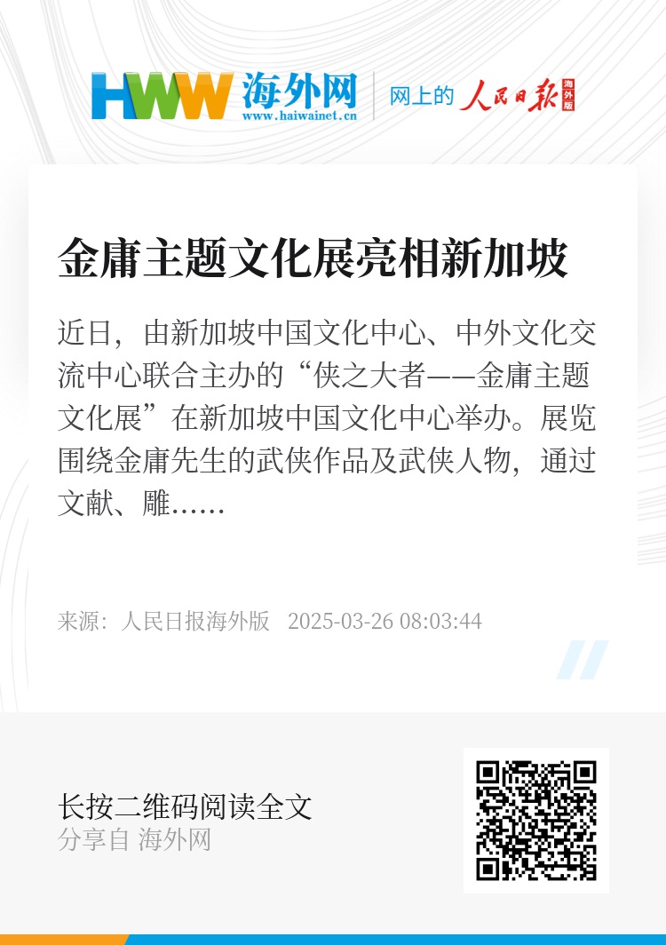 近日,由新加坡中国文化中心、中外文化交流中心联合主办的“侠之大者——金庸主题文化展”在新加坡中国文化中心举办。展览围绕金庸先生的武侠作品及武侠人物,通过文献、雕塑、服装、绘画、影像等多种艺术形式,全面展示金庸武侠世界的魅力,致敬金庸先生的文学和艺术成就。来自中新两国的200余位嘉宾出席开幕活动,展览将持续至4月11日。
