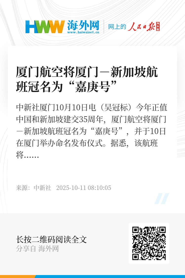 中新社厦门10月10日电(吴冠标)今年正值中国和新加坡建交35周年,厦门航空将厦门-新加坡航班冠名为“嘉庚号”,并于10日在厦门举办命名发布仪式。