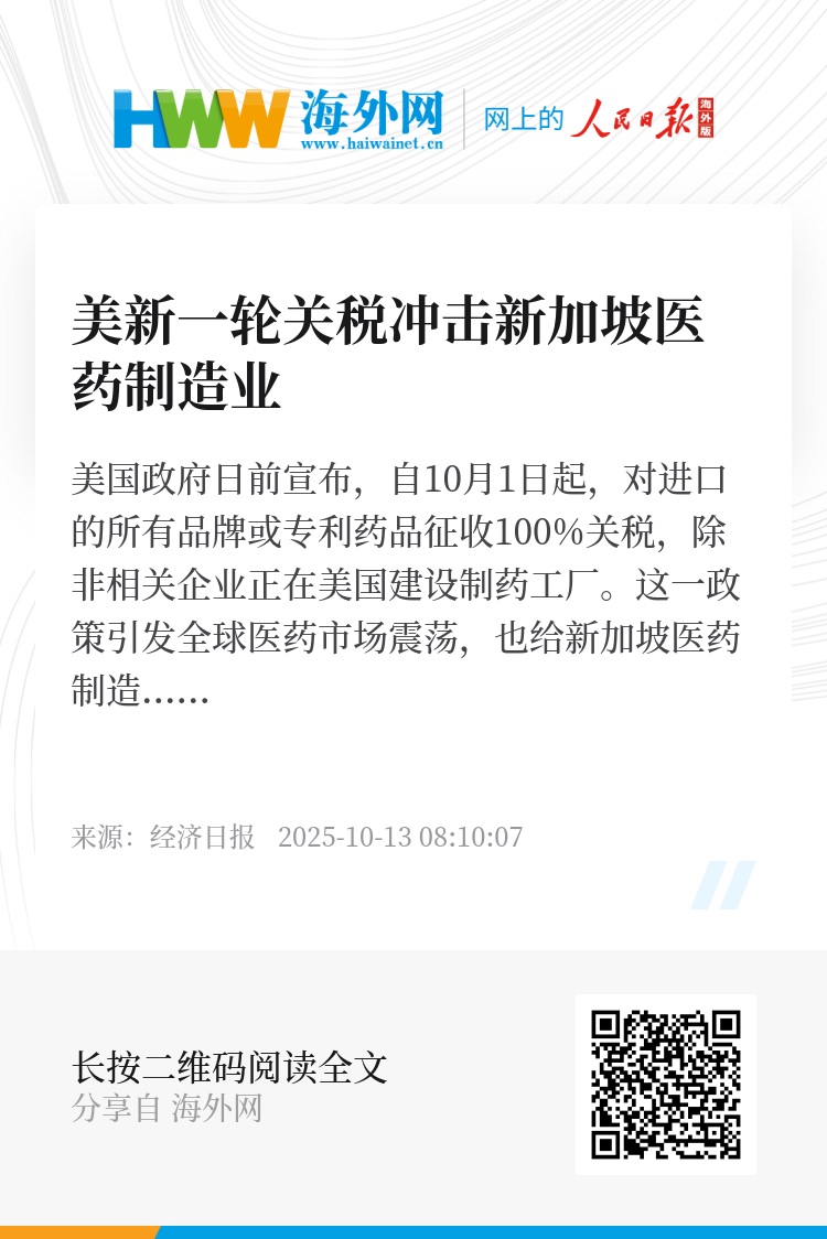 美国政府日前宣布,自10月1日起,对进口的所有品牌或专利药品征收100%关税,除非相关企业正在美国建设制药工厂。这一政策引发全球医药市场震荡,也给新加坡医药制造业带来巨大冲击。