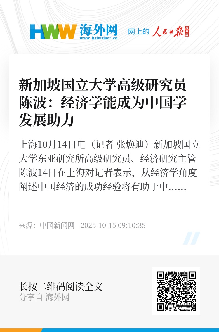 中新网上海10月14日电(记者 张焕迪)新加坡国立大学东亚研究所高级研究员、经济研究主管陈波14日在上海对记者表示,从经济学角度阐述中国经济的成功经验将有助于中国学这一新兴学科的发展。