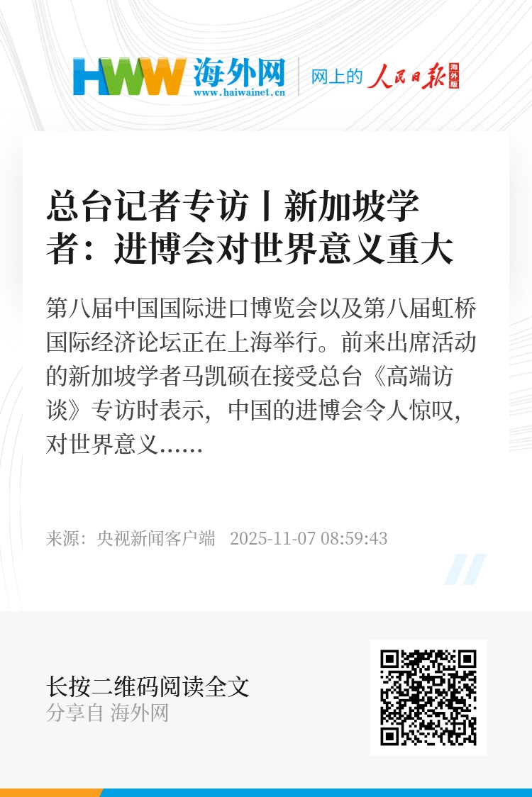 第八届中国国际进口博览会以及第八届虹桥国际经济论坛正在上海举行。前来出席活动的新加坡学者马凯硕在接受总台《高端访谈》专访时表示,中国的进博会令人惊叹,对世界意义重大。