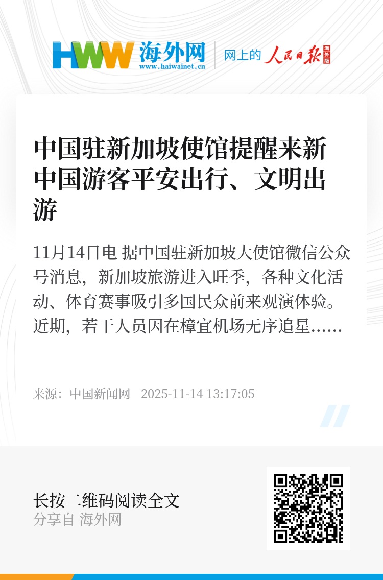 中新网11月14日电 据中国驻新加坡大使馆微信公众号消息,新加坡旅游进入旺季,各种文化活动、体育赛事吸引多国民众前来观演体验。近期,若干人员因在樟宜机场无序追星被警方调查,造成一定影响。中国驻新加坡使馆提醒来新中国公民注意以下事项,确保旅途安心舒心。