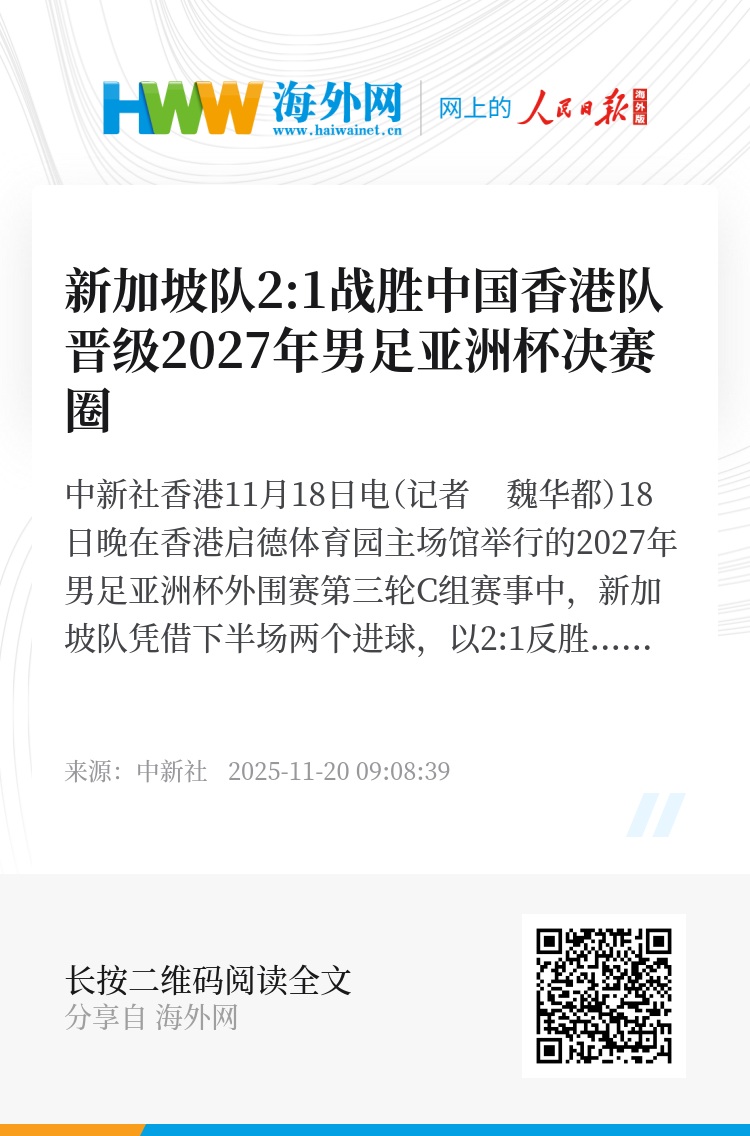 中新社香港11月18日电(记者 魏华都)18日晚在香港启德体育园主场馆举行的2027年男足亚洲杯外围赛第三轮C组赛事中,新加坡队凭借下半场两个进球,以2:1反胜中国香港队,晋级2027年男足亚洲杯决赛圈。