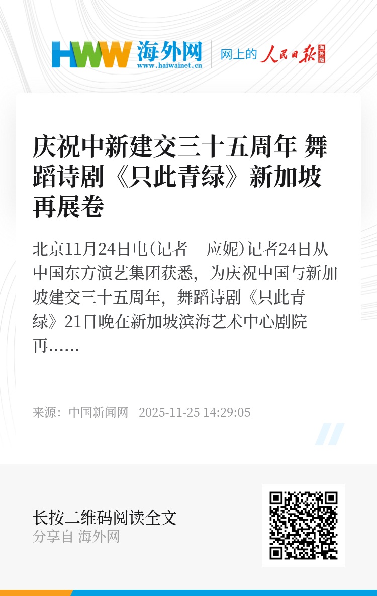 中新网北京11月24日电(记者 应妮)记者24日从中国东方演艺集团获悉,为庆祝中国与新加坡建交三十五周年,舞蹈诗剧《只此青绿》21日晚在新加坡滨海艺术中心剧院再度展卷,千年青绿与狮城灯火交相辉映。