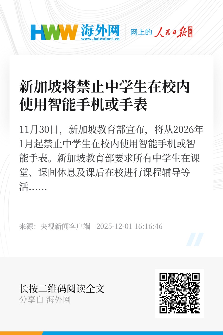 11月30日,新加坡教育部宣布,将从2026年1月起禁止中学生在校内使用智能手机或智能手表。新加坡教育部要求所有中学生在课堂、课间休息及课后在校进行课程辅导等活动时不能使用智能手机或智能手表。