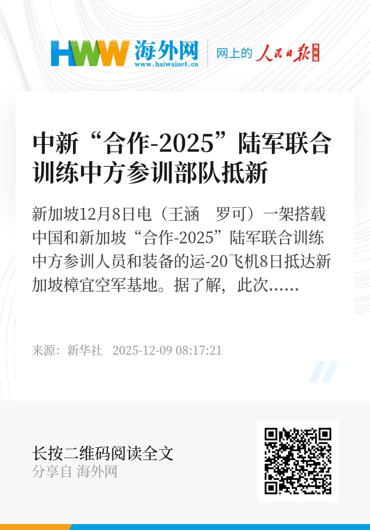 新华社新加坡12月8日电(王涵 罗可)一架搭载中国和新加坡“合作-2025”陆军联合训练中方参训人员和装备的运-20飞机8日抵达新加坡樟宜空军基地。