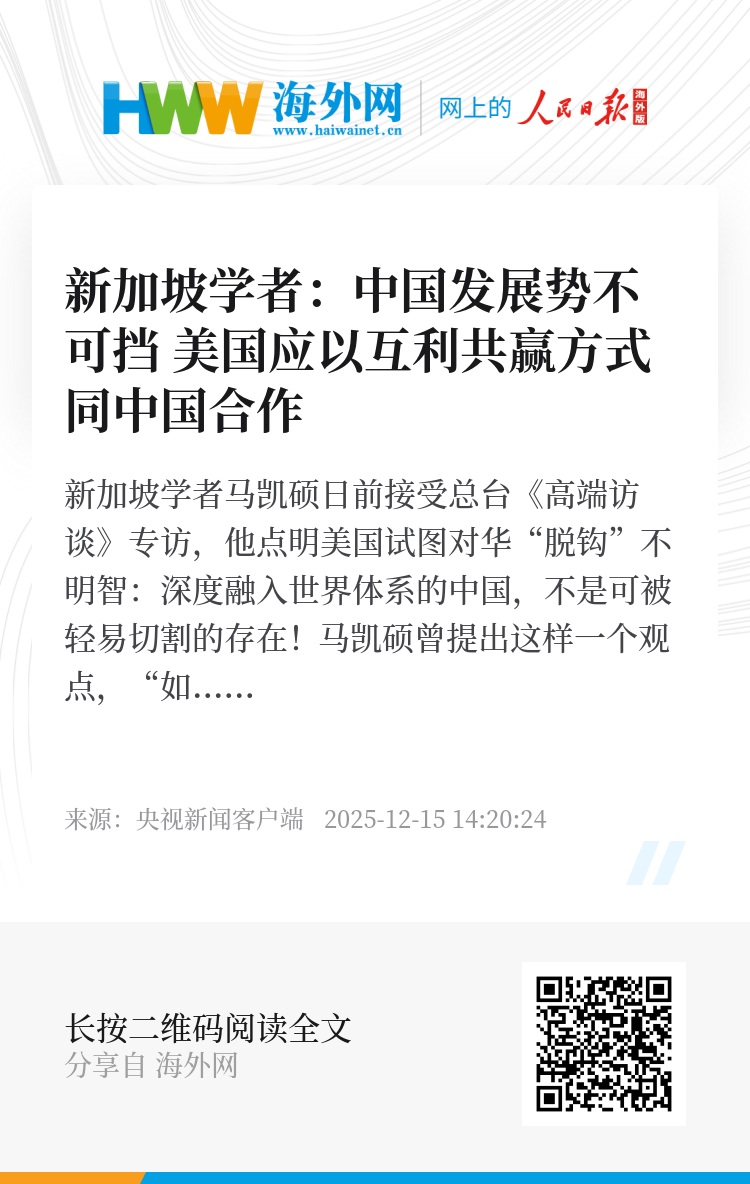 新加坡学者马凯硕日前接受总台《高端访谈》专访,他点明美国试图对华“脱钩”不明智:深度融入世界体系的中国,不是可被轻易切割的存在!