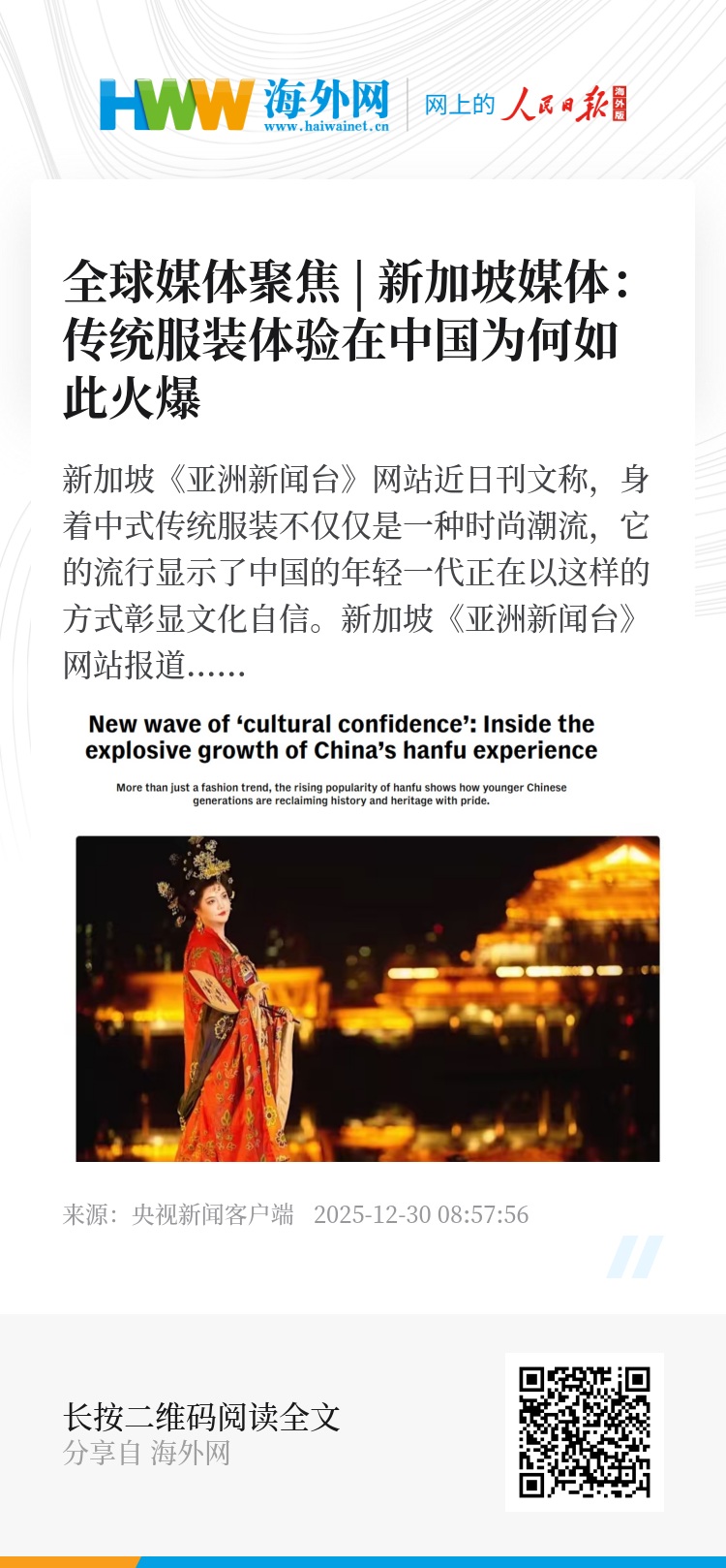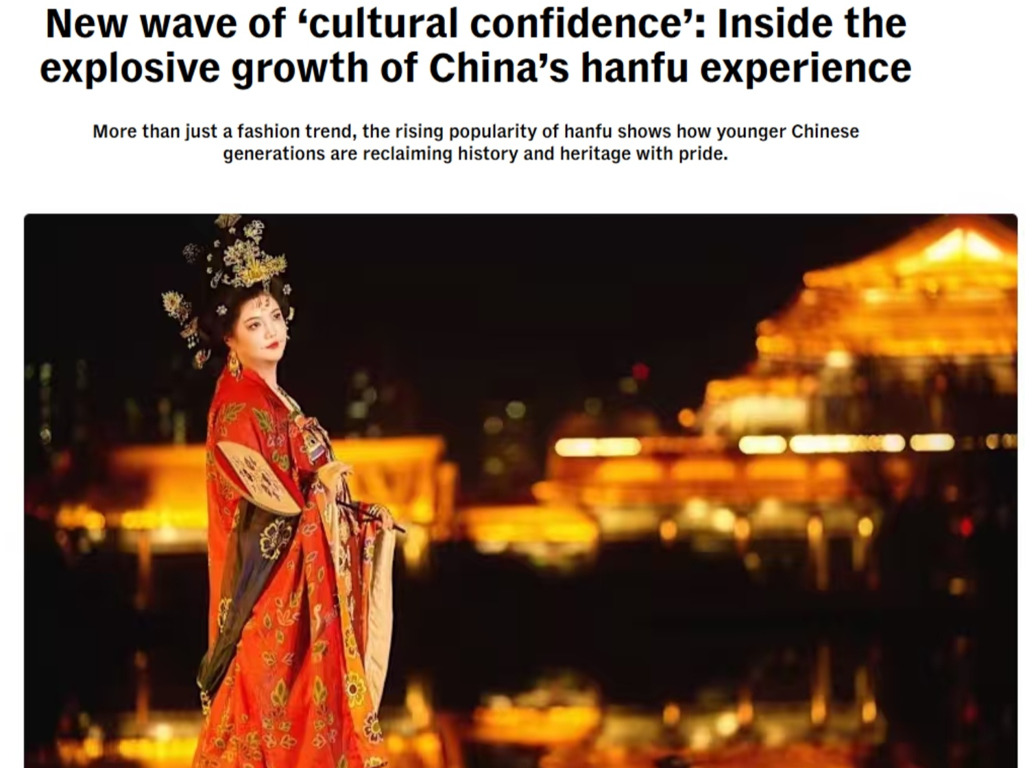 文章说,过去十年,中式传统服装重新流行起来,这些传统服饰已经存在了4000多年。今年“五一”假期期间,一家网络平台的传统服饰团购订单和传统服装体验比去年同期增长了662%。在全国各大热门旅游景点都能看到大量的传统服装租赁店和服饰妆造服务,从北京的故宫到西安的历史街区再到杭州西湖和苏州古典园林等热门景区都是如此。