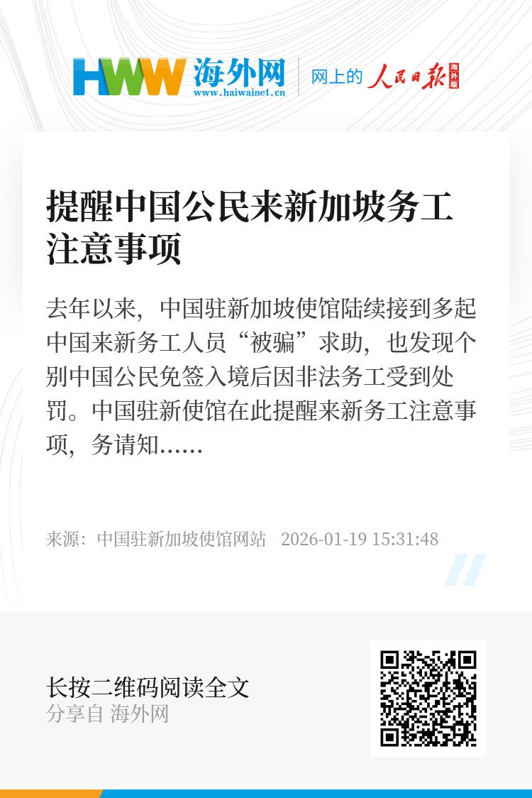 去年以来,中国驻新加坡使馆陆续接到多起中国来新务工人员“被骗”求助,也发现个别中国公民免签入境后因非法务工受到处罚。中国驻新使馆在此提醒来新务工注意事项,务请知法守法,安全出行。
