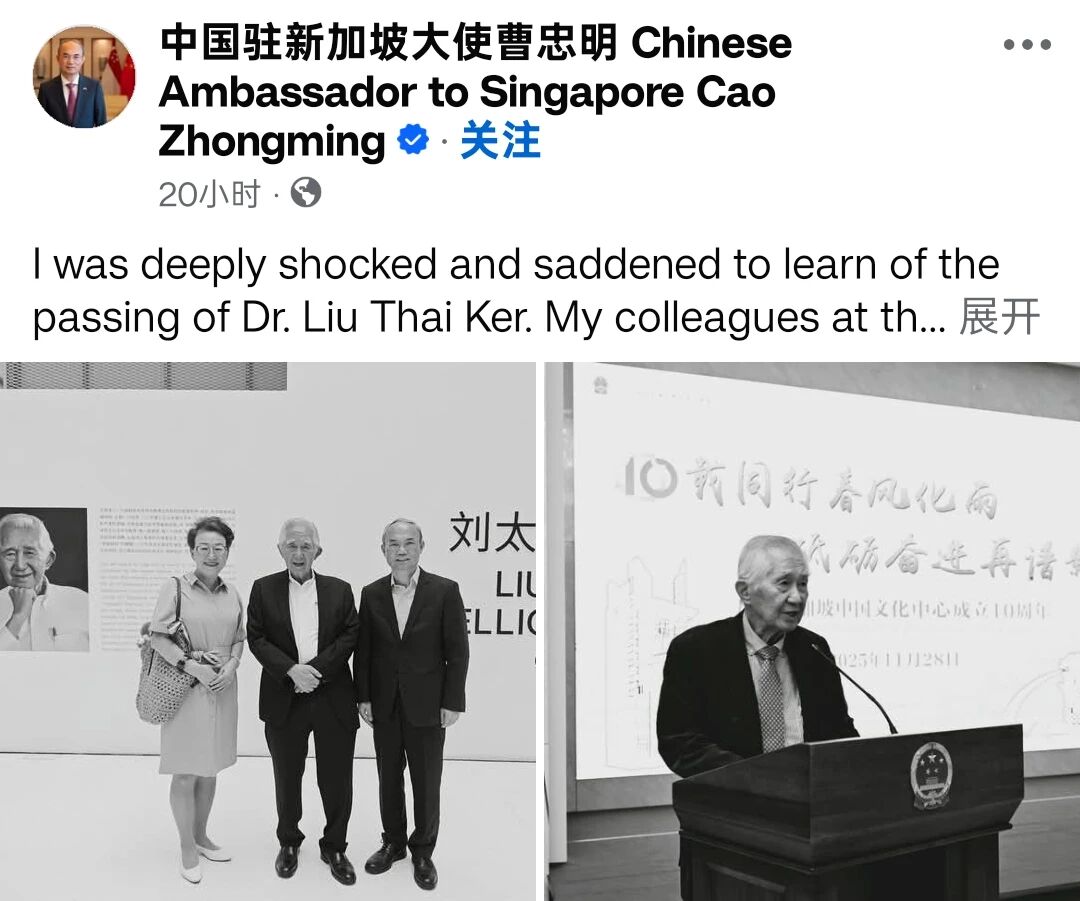 中国驻新加坡大使曹忠明发文悼念刘太格。(图源:曹忠明大使社交媒体截图)