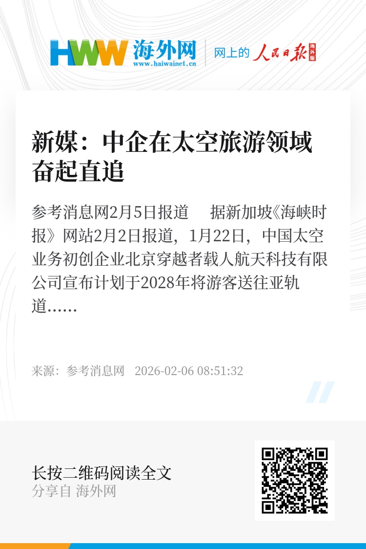 参考消息网2月5日报道 据新加坡《海峡时报》网站2月2日报道,1月22日,中国太空业务初创企业北京穿越者载人航天科技有限公司宣布计划于2028年将游客送往亚轨道太空,每张船票售价300万元人民币,这一消息在中国社交媒体上引发热议。