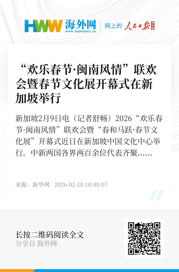 新华网新加坡2月9日电(记者舒畅)2026“欢乐春节·闽南风情”联欢会暨“春和马跃·春节文化展”开幕式近日在新加坡中国文化中心举行。中新两国各界两百余位代表齐聚一堂,共迎新春。