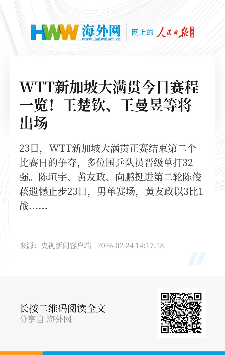 24日,2026年WTT新加坡大满贯进入正赛第三天,林诗栋、王楚钦、王曼昱、蒯曼等出场。具体赛程如下: