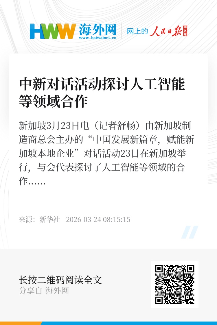 新华社新加坡3月23日电(记者舒畅)由新加坡制造商总会主办的“中国发展新篇章,赋能新加坡本地企业”对话活动23日在新加坡举行,与会代表探讨了人工智能等领域的合作前景。