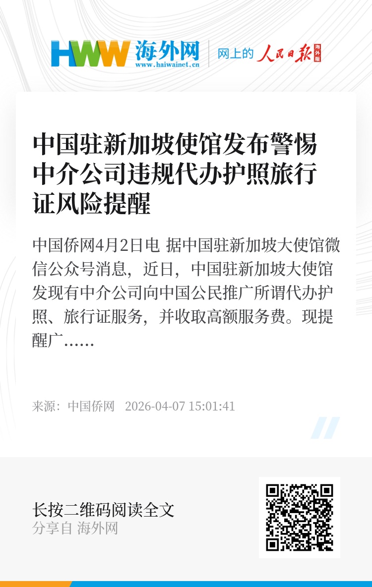 中国侨网4月2日电 据中国驻新加坡大使馆微信公众号消息,近日,中国驻新加坡大使馆发现有中介公司向中国公民推广所谓代办护照、旅行证服务,并收取高额服务费。现提醒广大在新中国公民,使馆从未授权任何中介公司(含旅行社)或个人代办领事证件业务,任何中介所谓代用“中国领事”APP申办护照、旅行证并收取服务费的行为均属违规行为。请中国公民高度重视中介代办的风险隐患,谨防上当受骗。