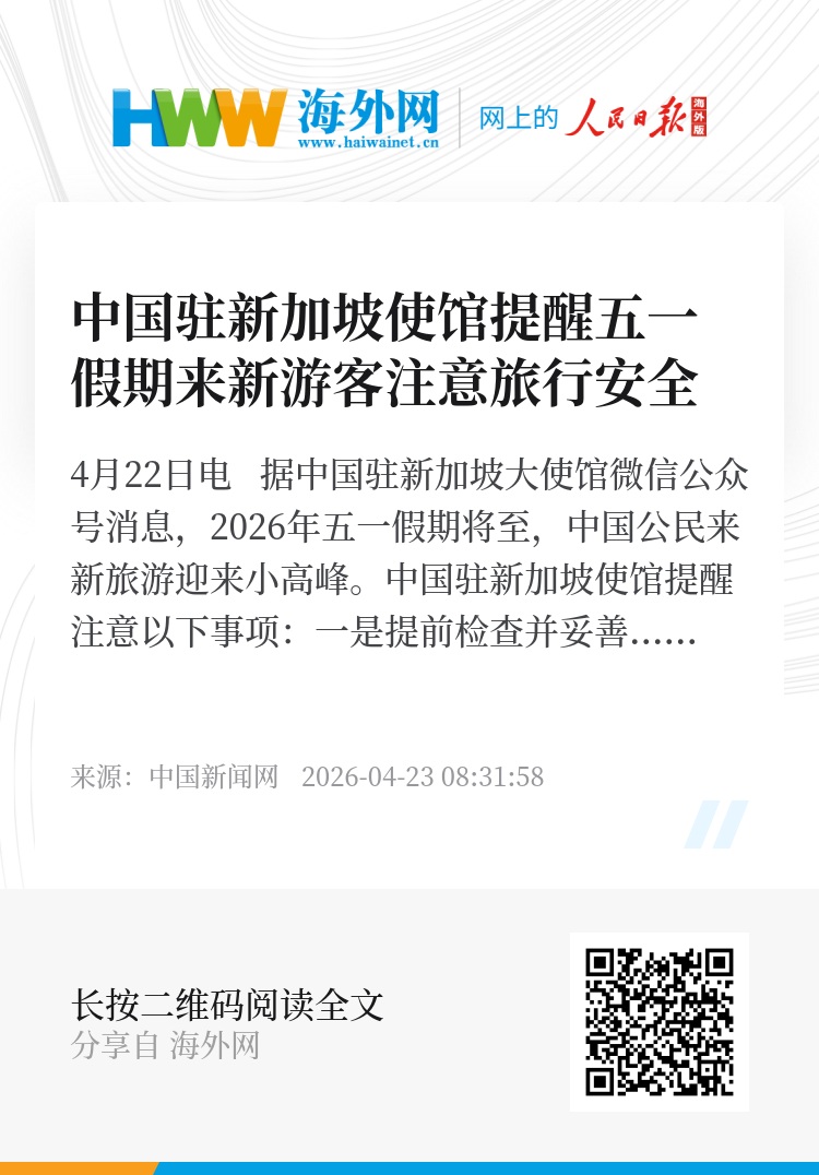 中国驻新加坡使馆祝大家文明出行、平安愉快!
